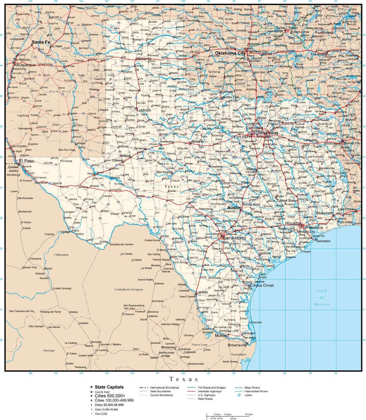 Texas Detailed Map in Adobe Illustrator vector format. Detailed